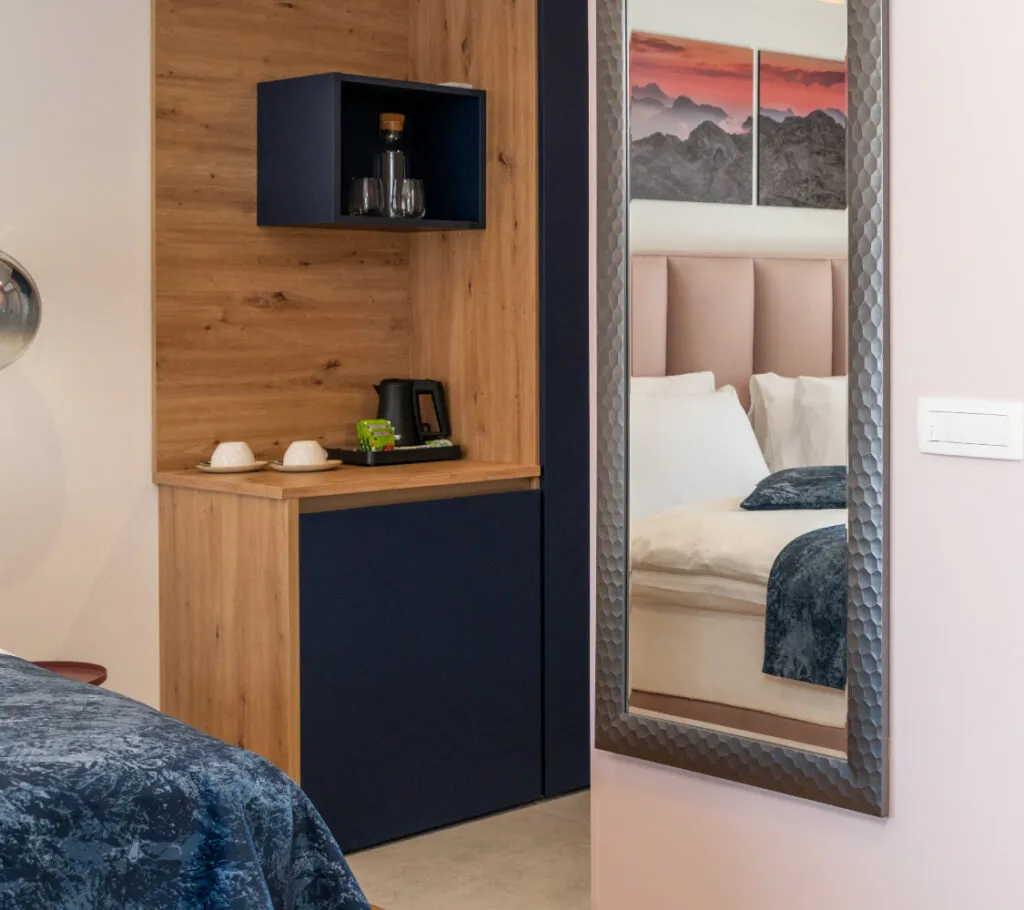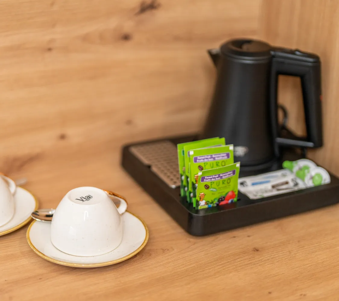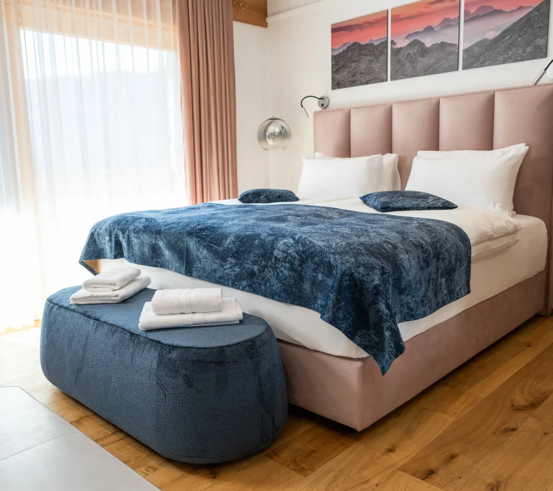 Das zimmer bietet höchsten Komfort zur Entspannung. Eine private Sauna, eine großzügige Badewanne und ausgewählte Materialien schaffen eine ruhige Atmosphäre. Kein Fernseher – eine bewusste Entscheidung für echte Erholung. Der Balkon rundet das alpine Erlebnis ab.