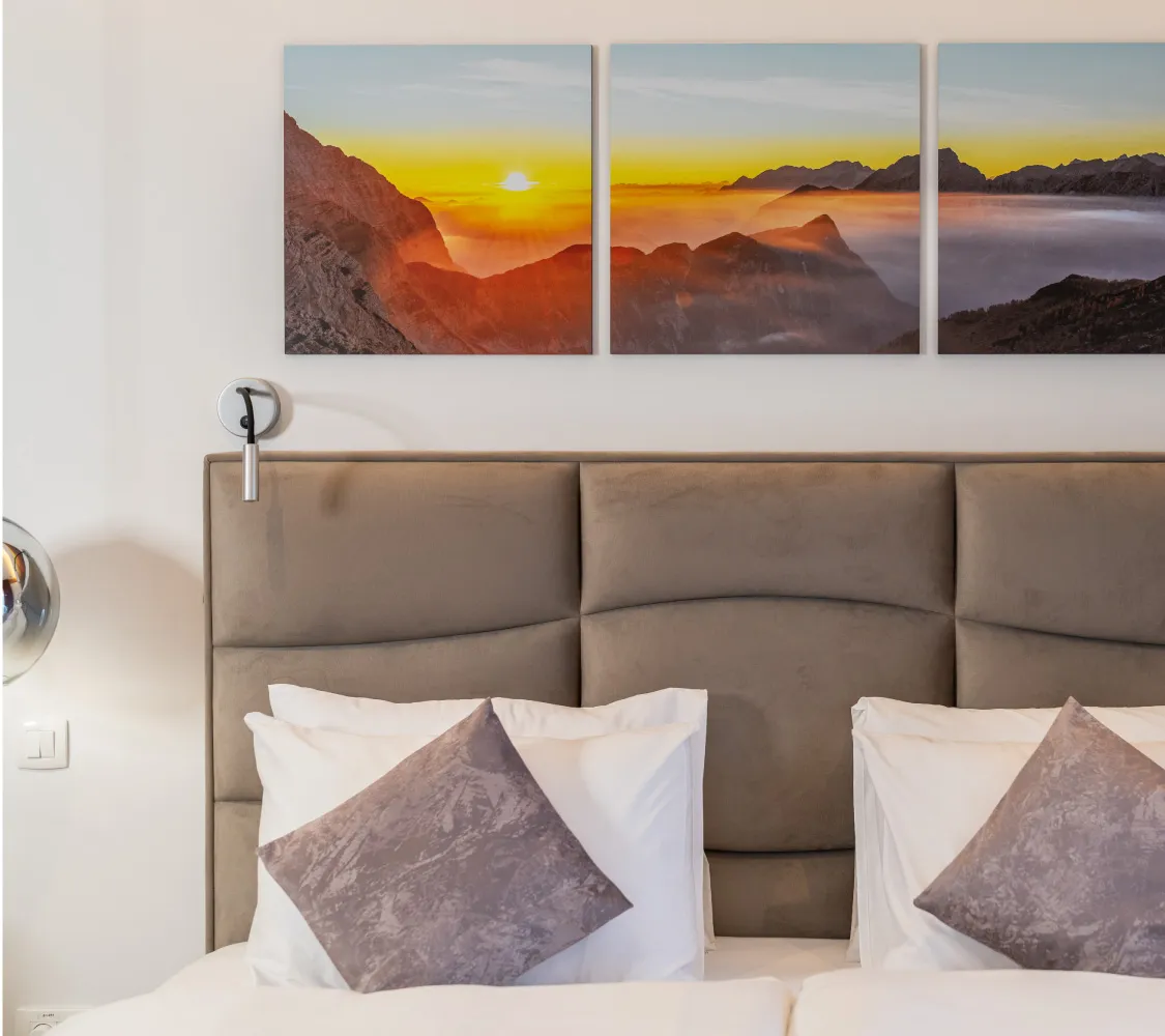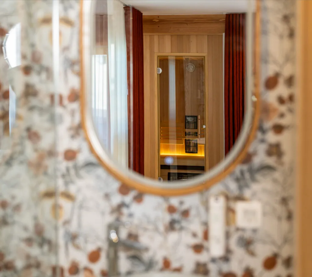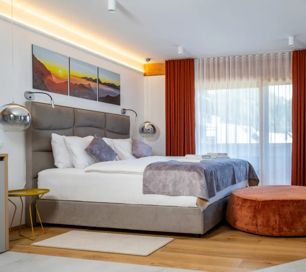 Das zimmer bietet höchsten Komfort zur Entspannung. Eine private Sauna, eine großzügige Badewanne und ausgewählte Materialien schaffen eine ruhige Atmosphäre. Kein Fernseher – eine bewusste Entscheidung für echte Erholung. Der Balkon rundet das alpine Erlebnis ab.