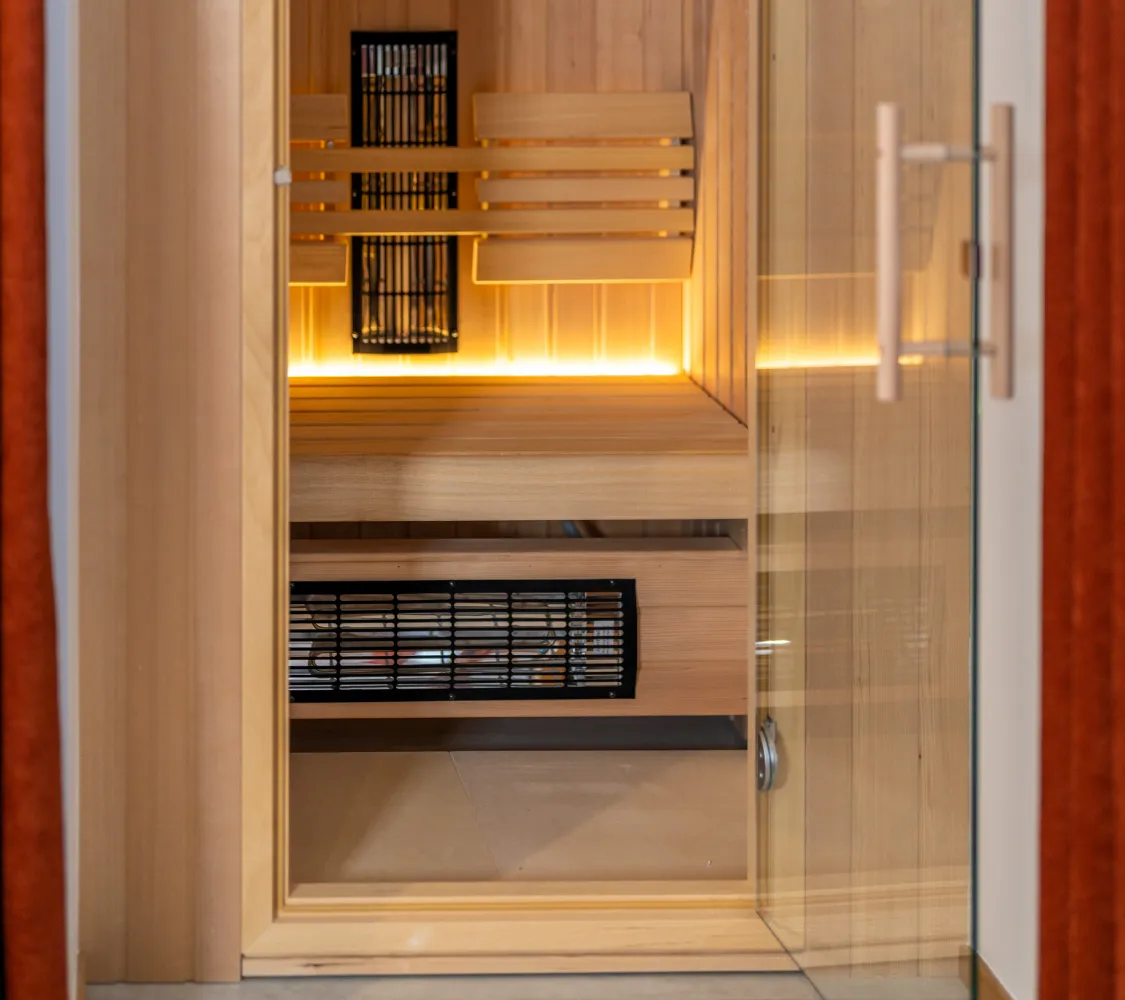 Helles, großzügiges Zimmer mit privater Sauna und Badewanne. Für Ruhe und Entspannung zu zweit.