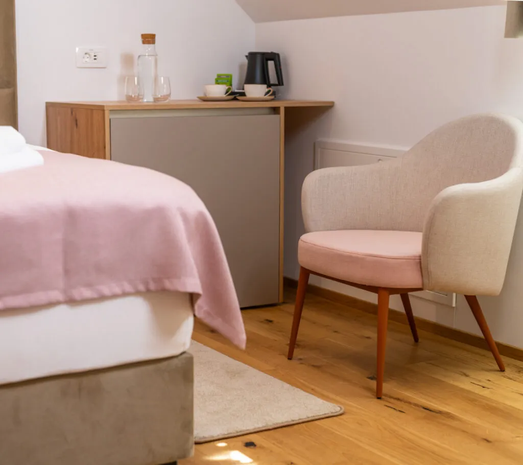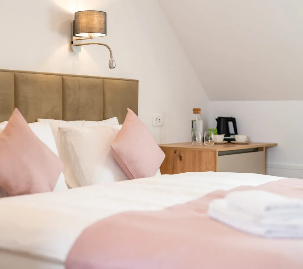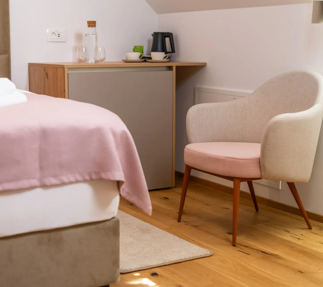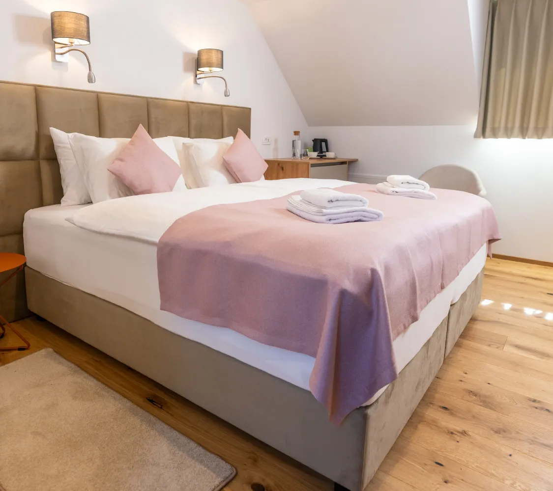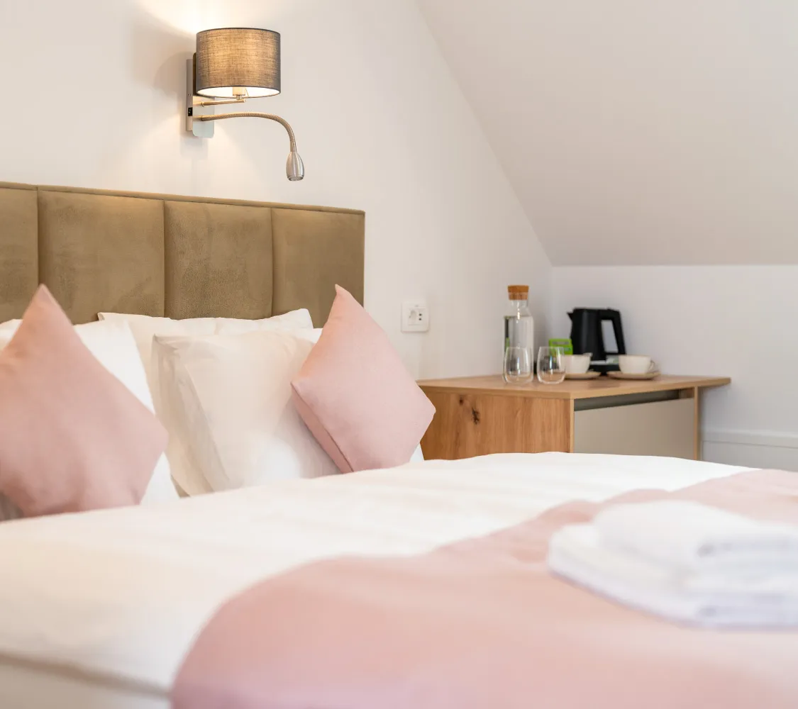 Dieses Zimmer unter dem Dach bietet mit seinen Dachschrägen und dem sanften Licht eine besonders behagliche Atmosphäre. Der Blick geht in den Innenhof, was für Ruhe sorgt. Das Bett kann in zwei Einzelbetten getrennt werden. Warme Materialien und liebevolle Details runden das Wohlgefühl ab.