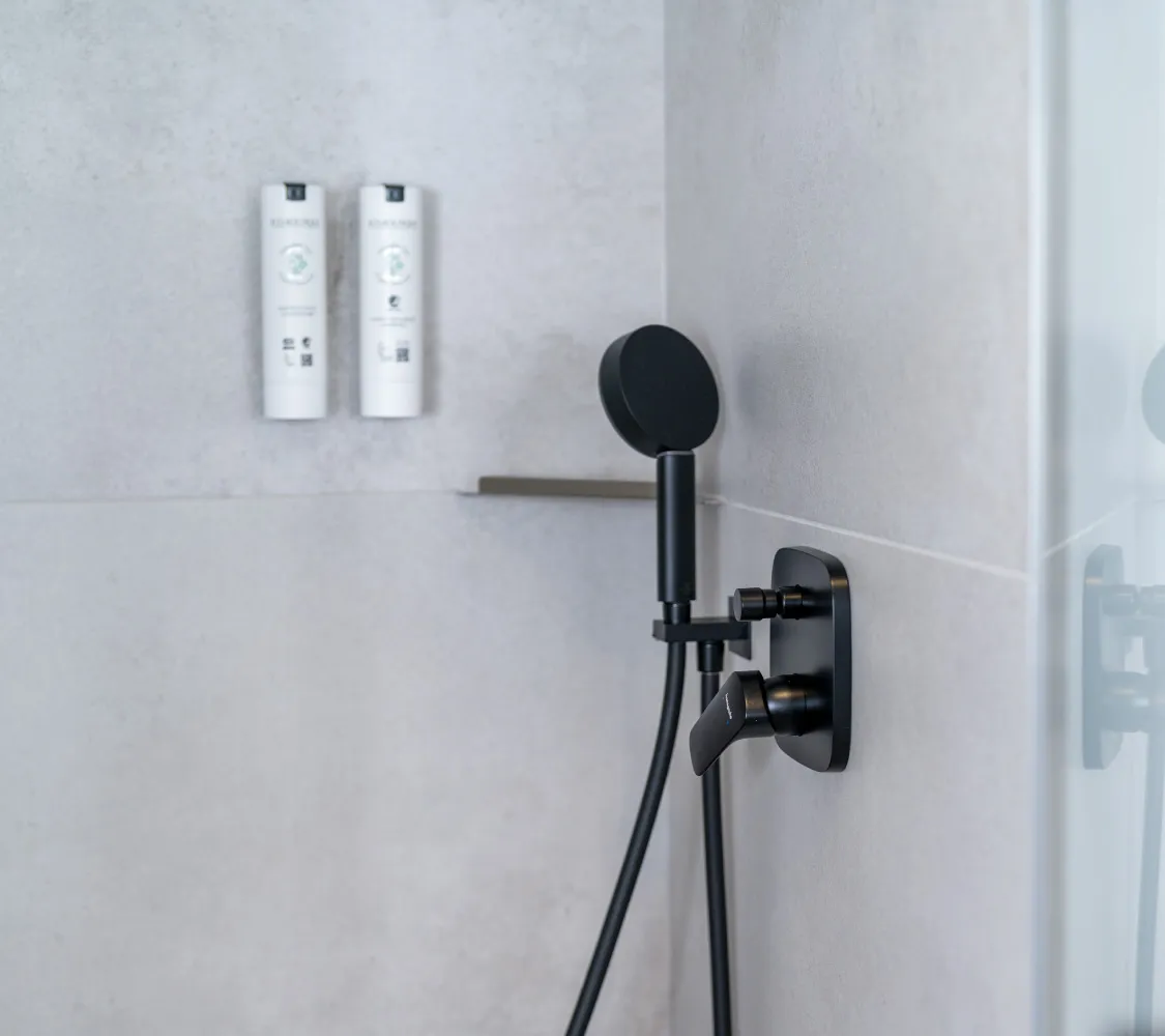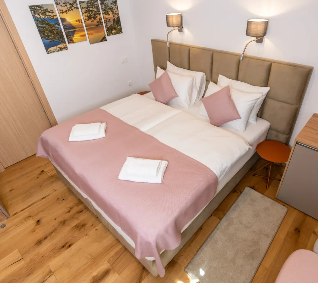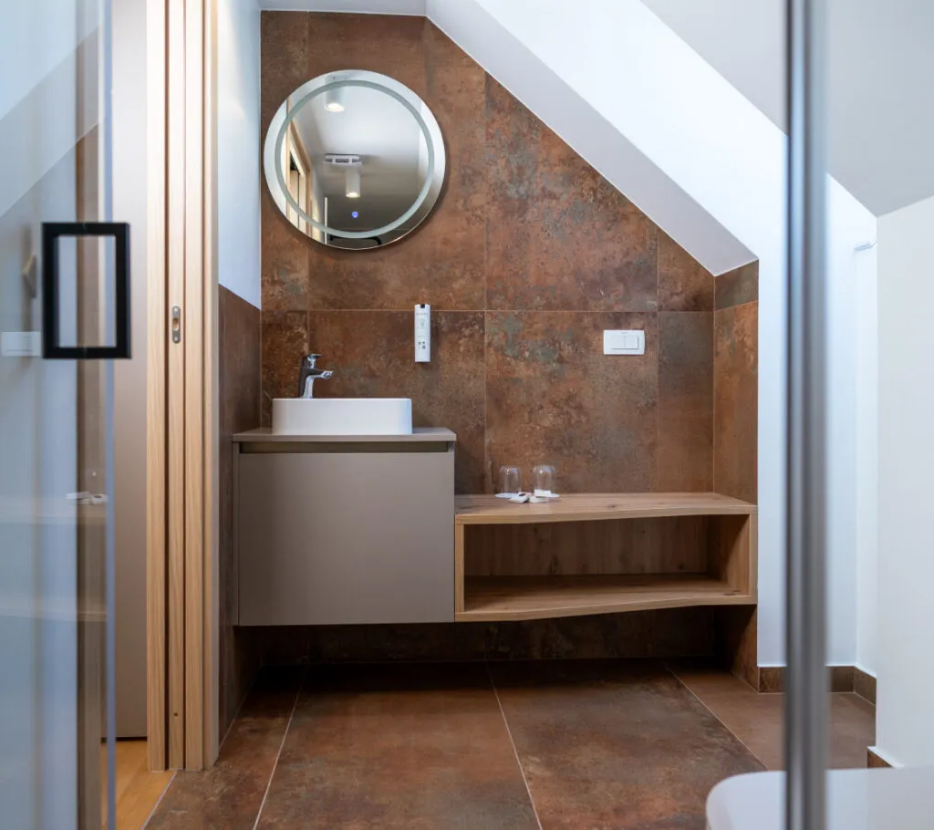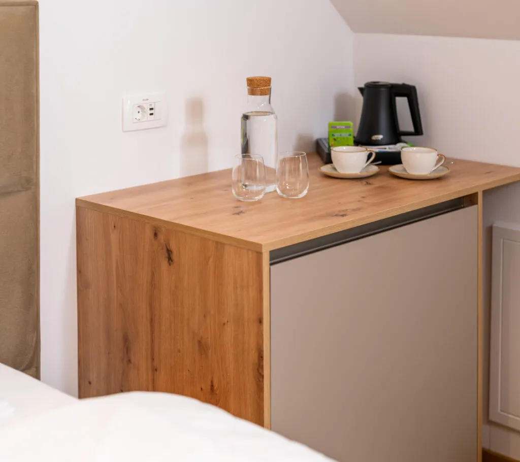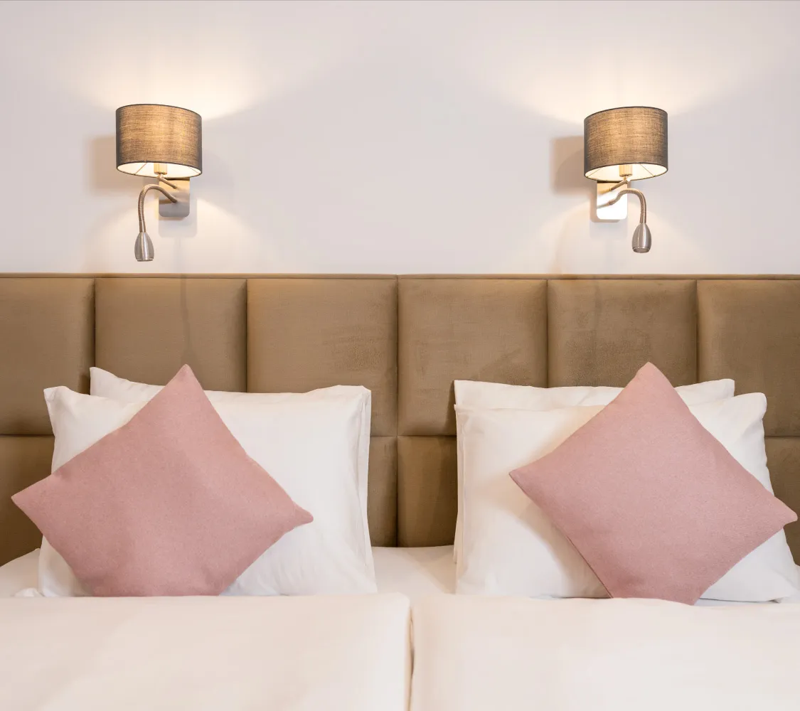 Dieses Zimmer unter dem Dach bietet mit seinen Dachschrägen und dem sanften Licht eine besonders behagliche Atmosphäre. Der Blick geht in den Innenhof, was für Ruhe sorgt. Das Bett kann in zwei Einzelbetten getrennt werden. Warme Materialien und liebevolle Details runden das Wohlgefühl ab.