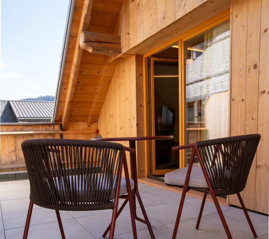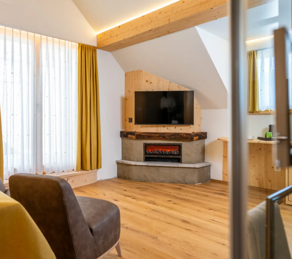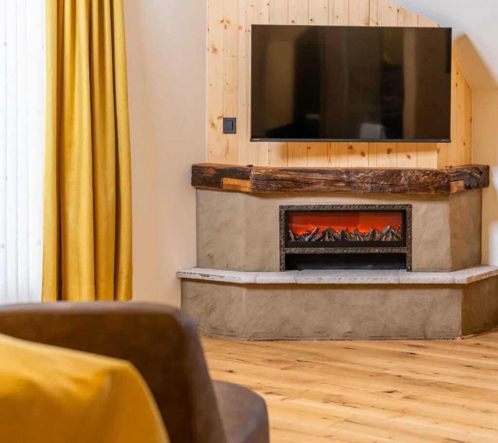 Soba s kaminom in zasebno teraso, kjer se srečata tradicija in udobje. Za večere v tišini in počasna jutra na svežem zraku.